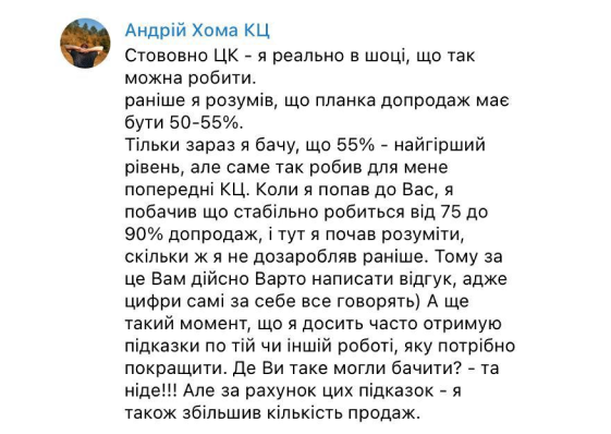 - Якісні зворотні зв'язки щодо помилок, навчання основних технік продажу
